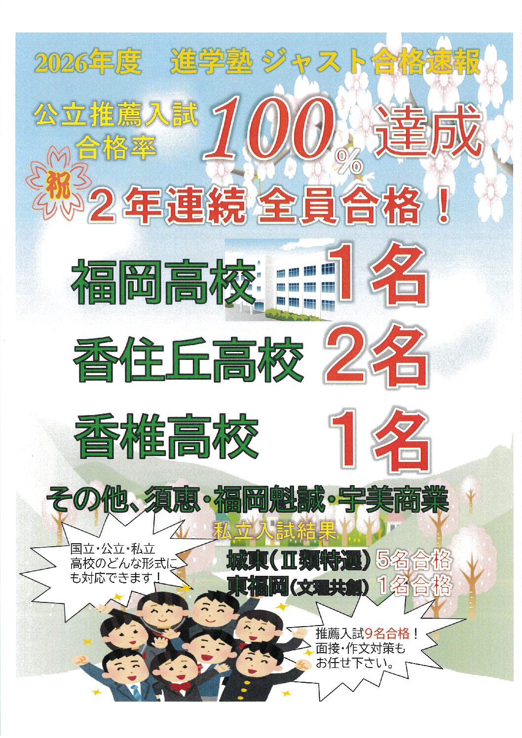 こんにちは、こんばんは。宇美駅前校の吉木です。 公立推薦・私立入試の合格状況を投稿します!
